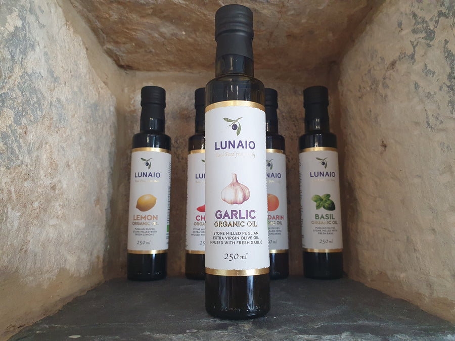 Organic garlic oil. An excellent cold pressed extra virgin olive oil with a soft and smooth infused garlic flavour. Fresh, organically grown garlic cloves are crushed and immersed in extra virgin olive oil for several days, to infuse the aroma and flavour of the garlic. This infusion brings a soft garlic fragrance to the oil, a delicious and mellow compliment to delicate dishes and raw food.