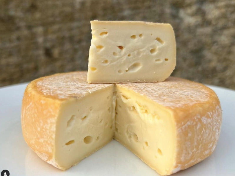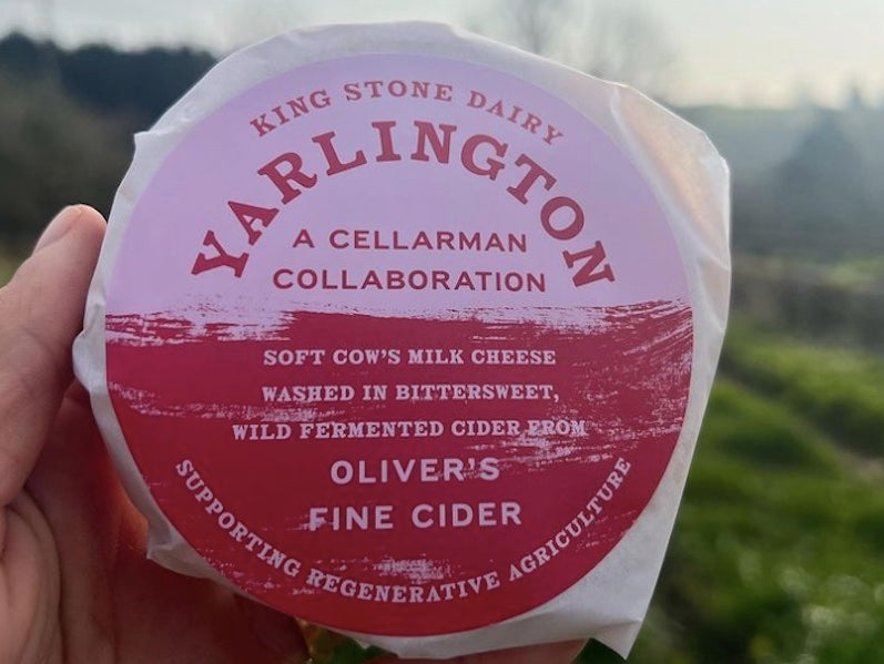Yarlington is the result of  a collaboration between cheesemaker David Jowett, cider maker Tom Oliver and Sam Wilkin.  The cheese make is inspired by the classic Alpine cheeses and sits somewhere between Evenlode and Rollright in terms of make process. The rind is gently washed in a solution of brine and Tom’s Yarlington Mill 2019 cider. Yarlington itself is named after Yarlington Mill in Somerset. The home of the first example of the Yarlingtom Mill apple now one of the cornerstones of British Cider making.